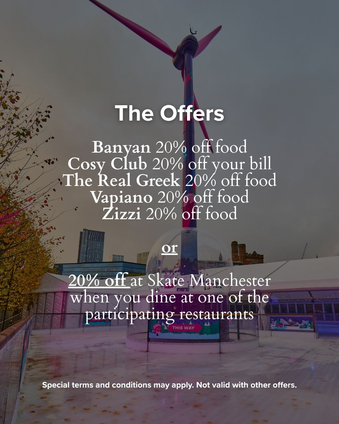 Terms and Conditions: Not valid with other offers. You must show a same-day ticket or booking receipt from the skating rink to qualify for the discount at the 5 participating Corn Exchange restaurants. You must show a same-day receipt from the 5 participating Corn Exchange Manchester restaurants (Banyan, Cosy Club, The Real Greek, Vapiano or Zizzi) to get 20% off skating tickets.